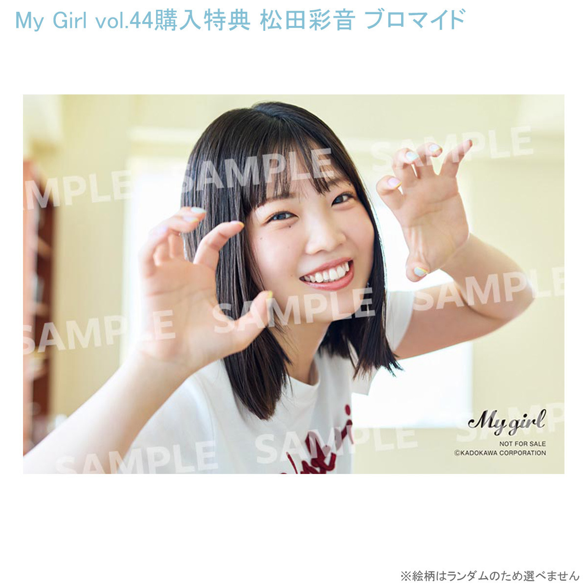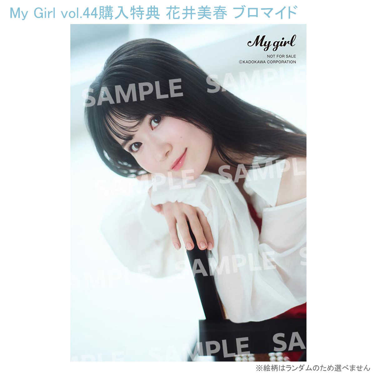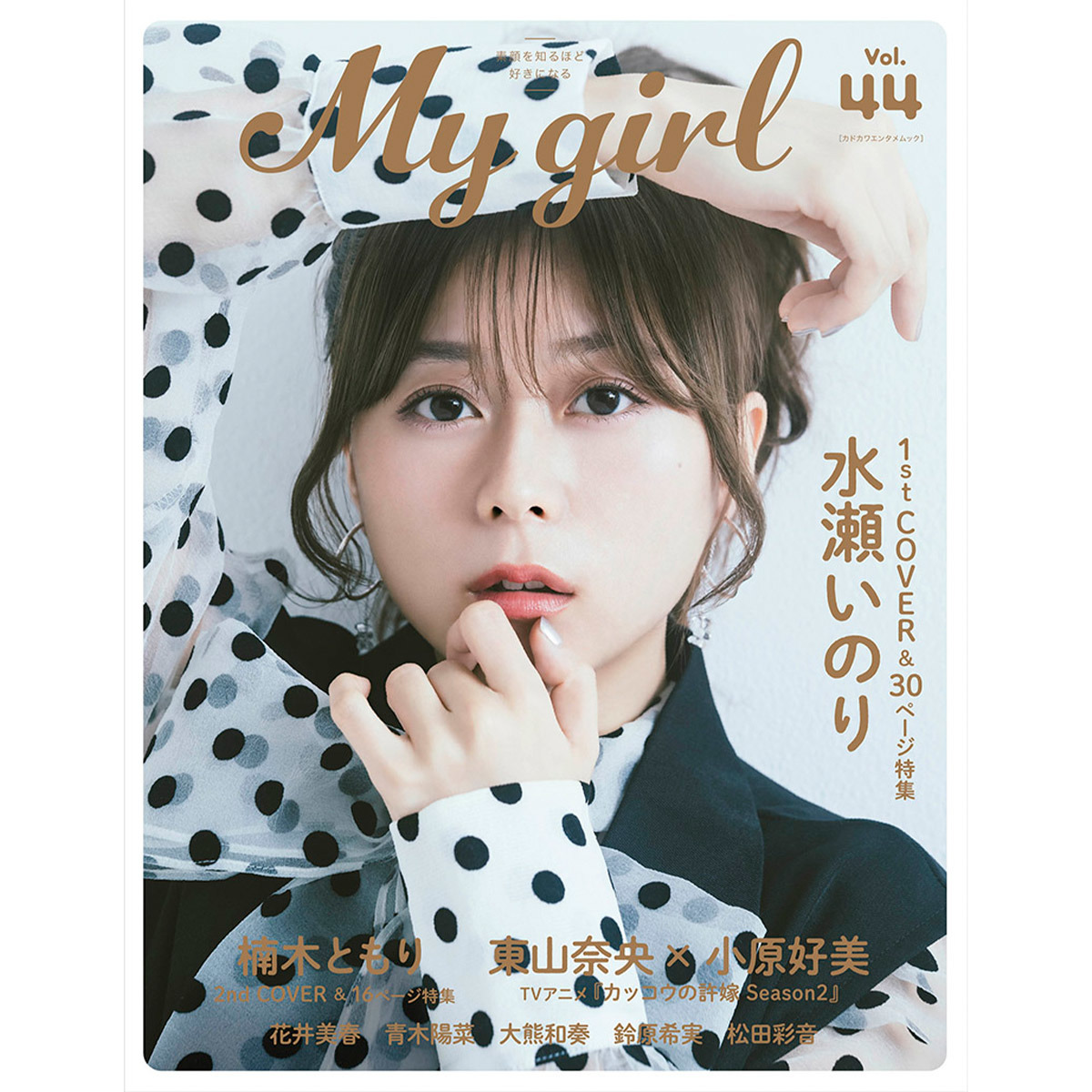 <My Girl Store限定特典> 下記2種より1種お選びください。 花井美春 ブロマイド1枚(L判 / 絵柄2種 / ランダム封入) 松田彩音 ブロマイド1枚(L判 / 絵柄2種 / ランダム封入) ※絵柄はランダムとなります ※品切れの場合もございます 「My Girl vol.44」CONTENTS ■1st COVER(表紙) 水瀬いのり ■2nd COVER(裏表紙) 楠木ともり ■SPECIAL ISSUE ※2号連続特集 TVアニメ『カッコウの許嫁 Season2』 東山奈央×小原好美 ■FEATURE’s 青木陽菜 大熊和奏 鈴原希実 ■The 5 Words -気になる声優の“今”を言語化- 花井美春 ■SPOTLIGHT 松田彩音を知る100問100答 ■重大発表 野中ここな ■発売日 2025年9月11日(木) ※お届け予定※ 発売日より遅れてのお届けになります。 ・9月5日までにご注文分は、9月11日発送となります。 ・9月6日以降注文分は、9月12日以降に順次発送となります。